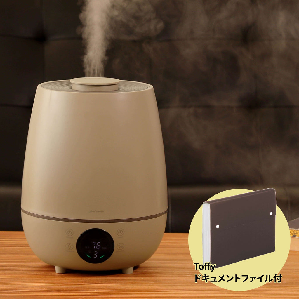 「plus more 上部給水超音波式加湿器 湿度コントロール付」、書類を機能的に分類できるジャバラ式ポケットの「Toffy ドキュメントファイル」のセットです。