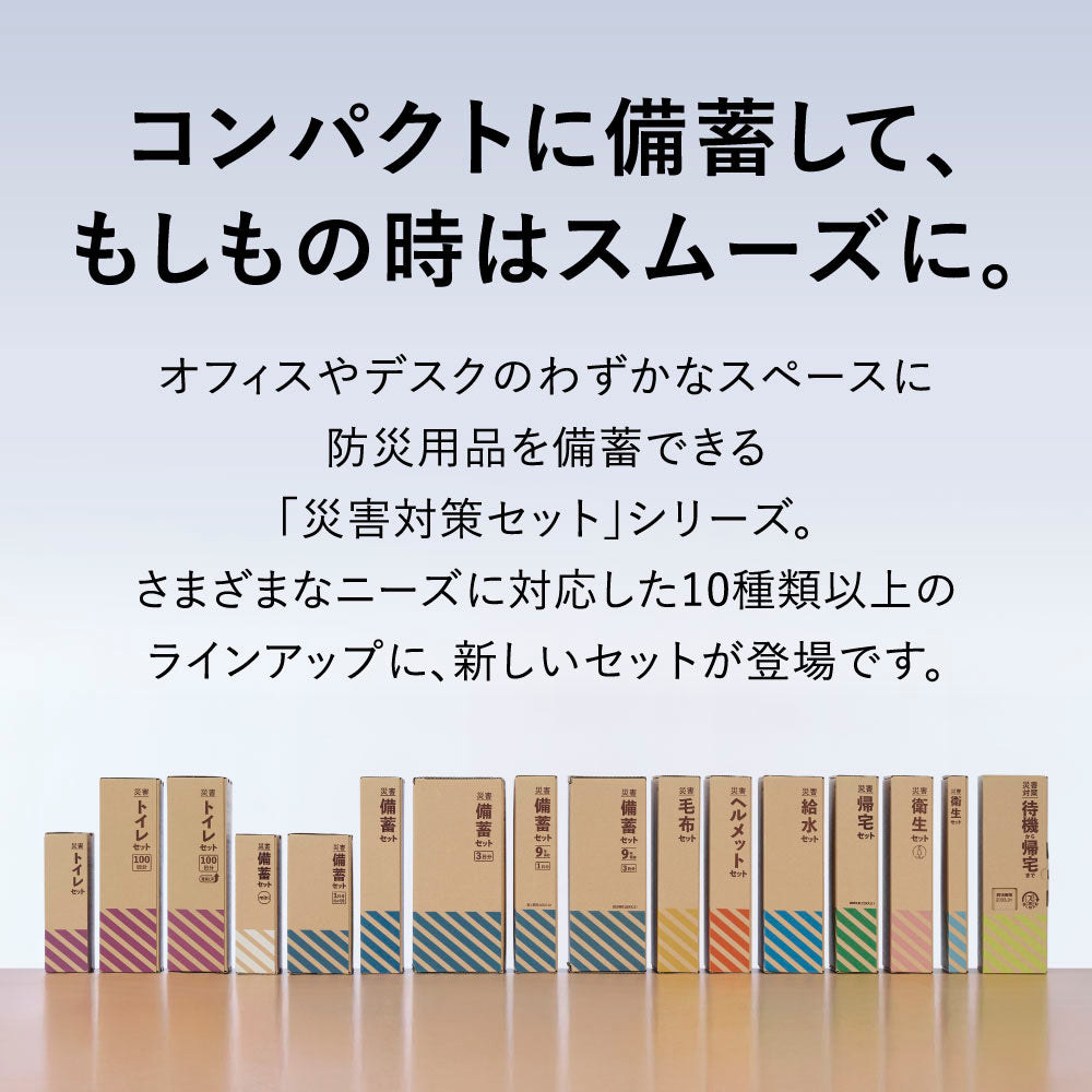 500mlの飲料水やクッキー、簡易トイレなどが3日分、A4ファイルサイズの個装箱にコンパクトに収まっており、キャビネットやデスクのわずかなスペースで防災用品を備蓄できます。