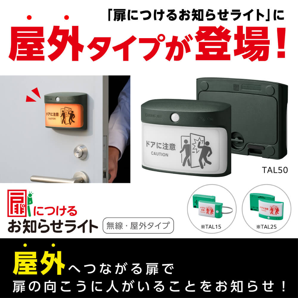 扉の向こうに人がいることをお知らせして、扉の開閉による衝突を防ぐ「扉につけるお知らせライト」の屋外対応タイプです。