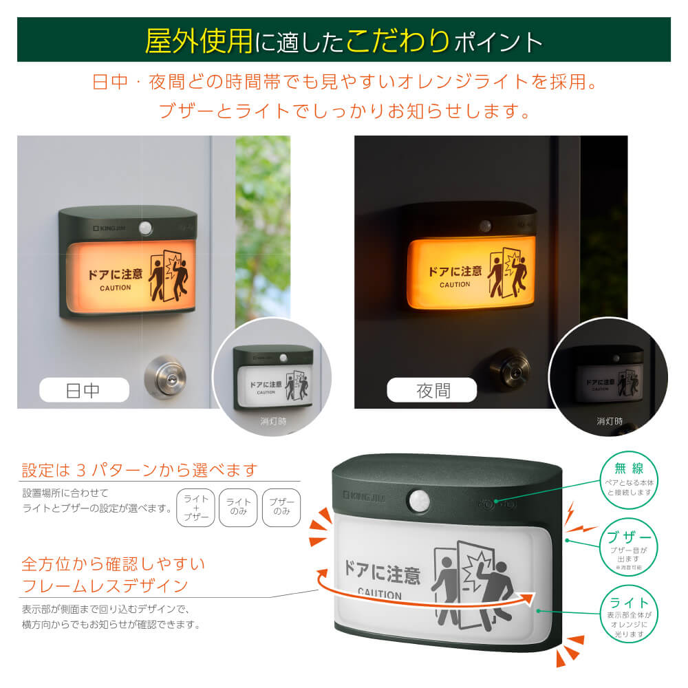 昼夜問わず見やすいオレンジライトを採用し、ブザー音と組み合わせてしっかり注意喚起します。