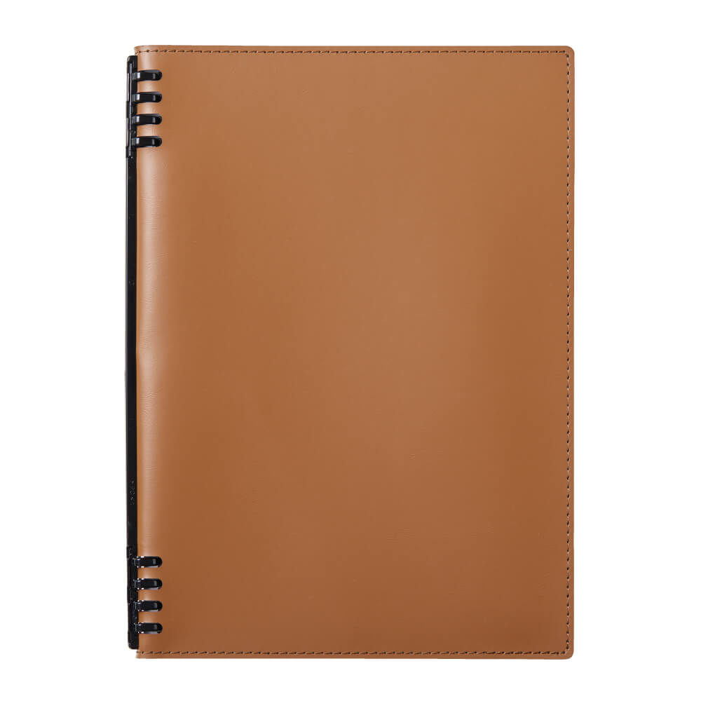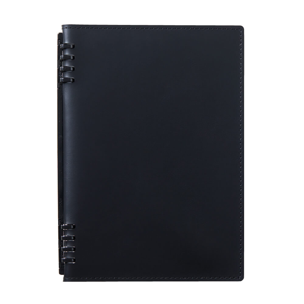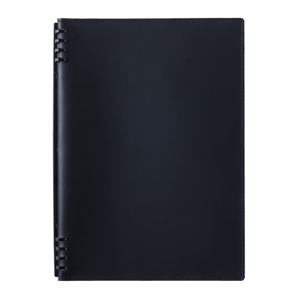 合皮製で重厚感のあるデザイン。リーフは使いやすい方眼リーフを採用。