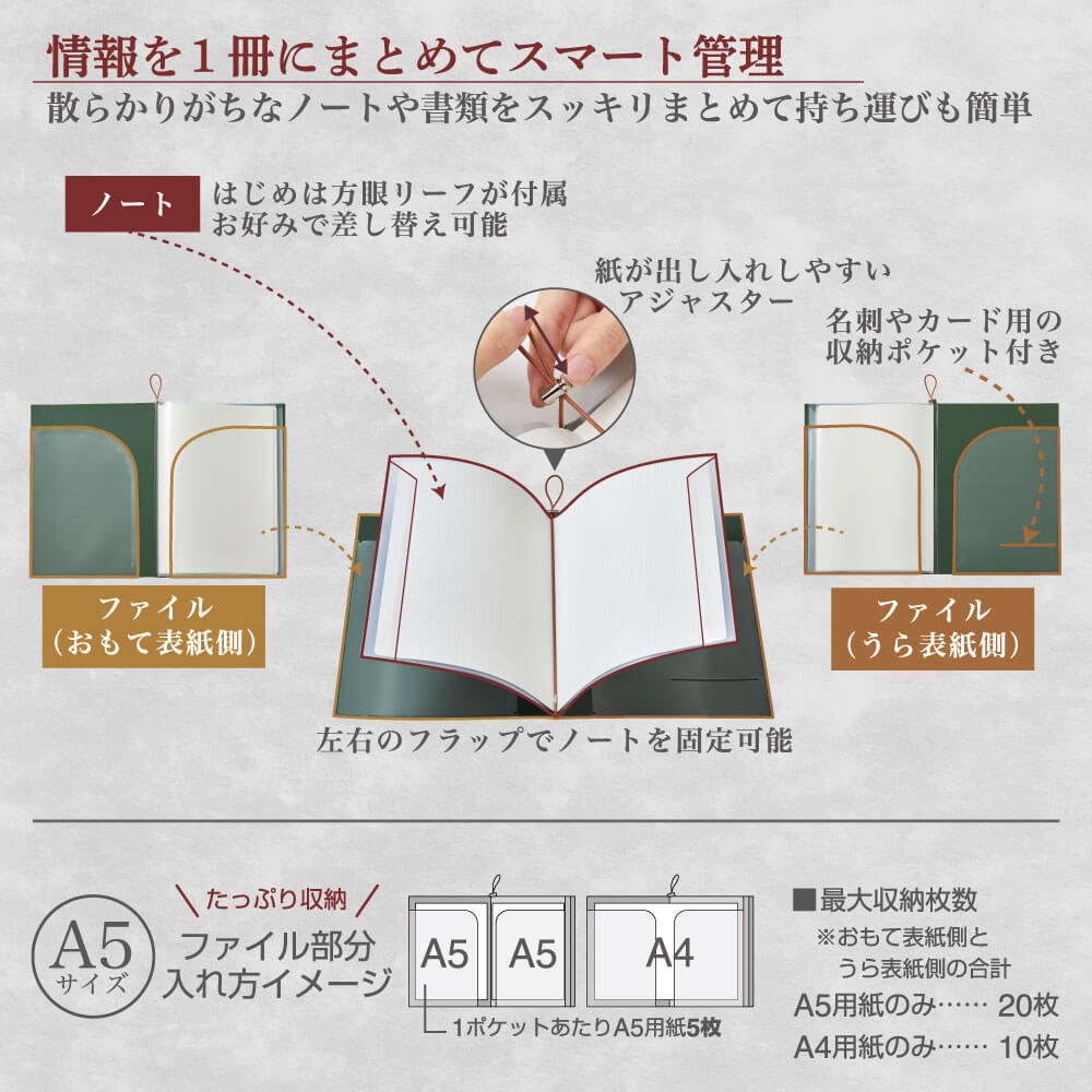 | 最大収納枚数 | ノート部分 A4 10枚(40ページ相当) ファイル部分 A5のみの場合20枚、A4のみの場合10枚 ※おもて表紙側とうら表紙側をあわせた枚数です。 |