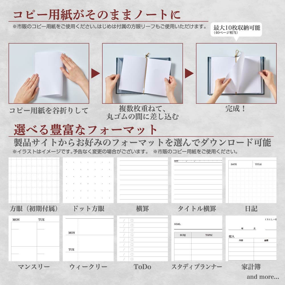 ノート部分には方眼リーフが付属していますが、使い切った場合でもコピー用紙を折って挟むことで、コピー用紙をノートとしてご利用いただけます。