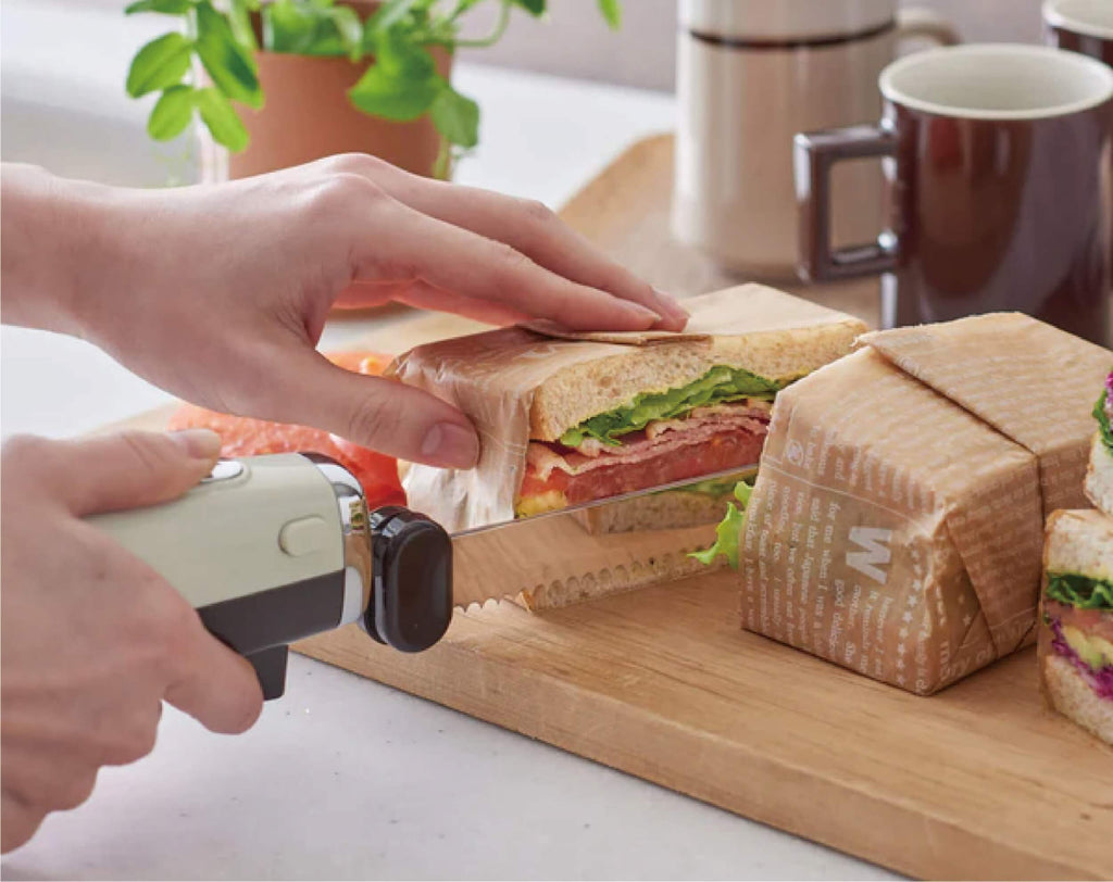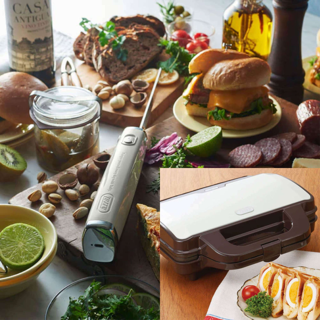 包丁では切りにくい焼きたてのふわふわ食パンや硬いフランスパンまで、刃をあてるだけでらくらくカット!「Toffy 電動マルチナイフ<充電式>」と手軽にホットサンドが作れる「Toffy ホットサンドメーカー」のお得なセット!