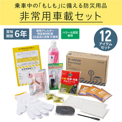| セット内容 | 保存水(500ml)、クッキー(3本入)、備蓄氷糖×2個、非常用簡易トイレ×3個(汚物収納袋+抗菌性凝固剤)、ホイッスル、軍手、マスク、アルミブランケット、アイマスク、ポケットティッシュ、連絡カード、ペン(鉛筆芯) |