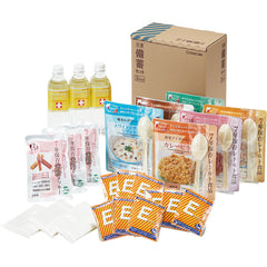 | セット内容 | ご飯(スプーン付)×6食(わかめご飯 / 五目ごはん/カレーピラフ/ コーンピラフ/トマトリゾット/ホワイトシチューリゾット×各1食)、保存水(500ml)×3本、ポケットティッシュ×3個、クッキー(3本入)×3袋、非常用簡易トイレ(汚物収納袋+抗菌性凝固剤)×9個 ※食物アレルギー特定原材料等28品目と貝類不使用 ※ハラール認証取得 |