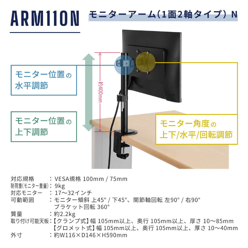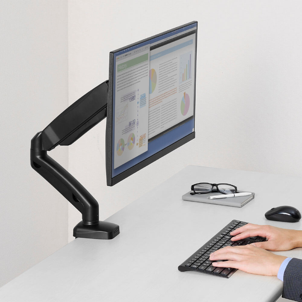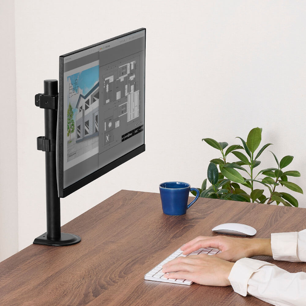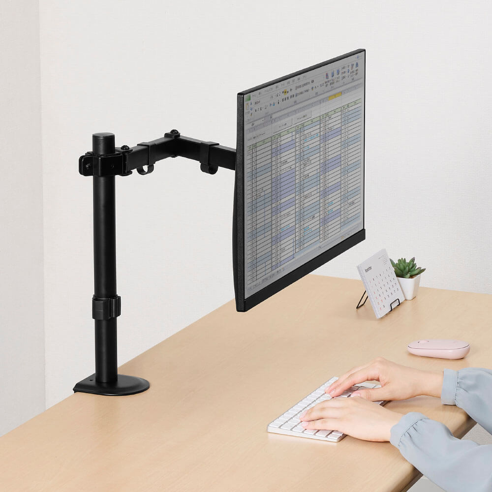 最適な目線の高さにモニターを調整できるシンプルな1面2軸タイプのモニターアームです。高さと角度の調節が簡単にできるため、複数人で共有するモニターにも最適です。シンプルで使い勝手が良いため、オフィスはもちろん自宅でのテレワーク用としても適しています。