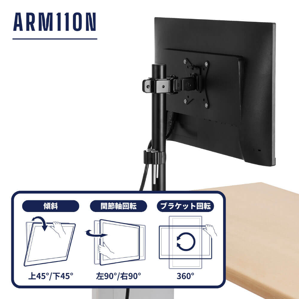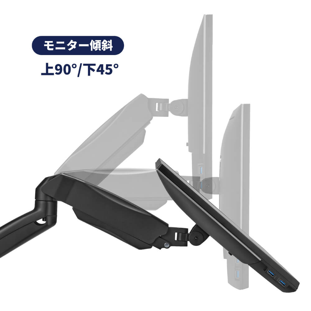 モニター傾斜は上下45°・関節軸は左右90°に回転するので、モニター画面の傾き・左右の向き・角度を細かく調節できます。モニターを設置するブラケット部分は360°回転可能なので画面を縦向きに設置することもできます。