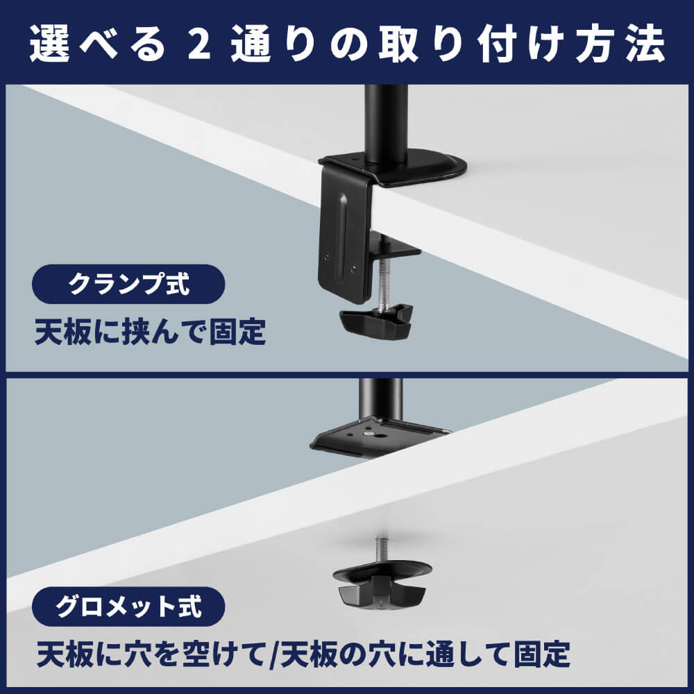 天板に穴を開けず挟んで固定する「クランプ式」と、天板に穴をあけてより強く固定できる「グロメット式」の2タイプの取り付け方法に対応しています。クランプ式は最も一般的なタイプで板状の天板であれば簡単に設置可能です。グロメット式はデスクの背面側にスペースがない場合や、デスクが壁付けの場合などに設置可能な取り付け方法です。