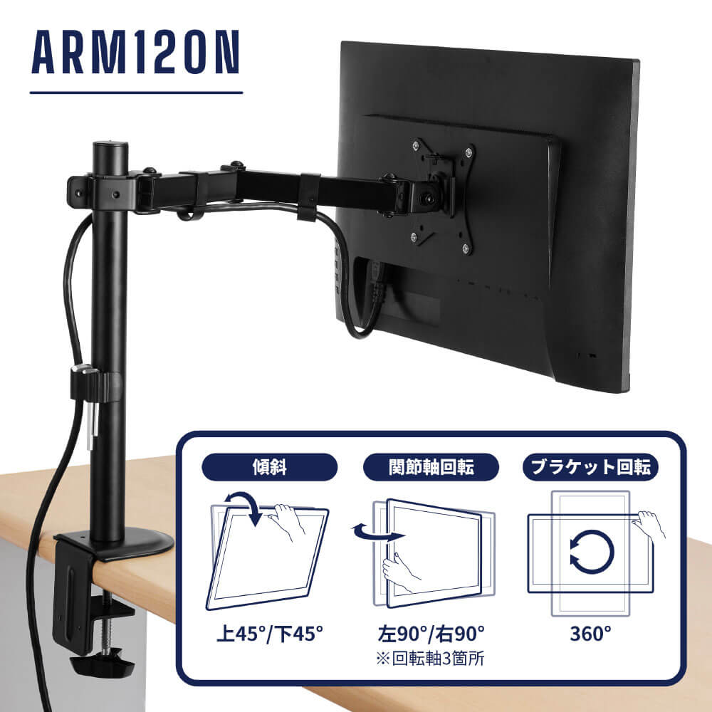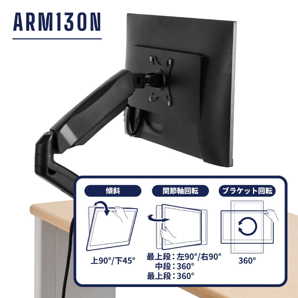 | 可動範囲 | モニター傾斜 上90°/下45°、関節軸回転 最上段 左90°/右90°・中段360°・最下段360°、ブラケット回転360° |