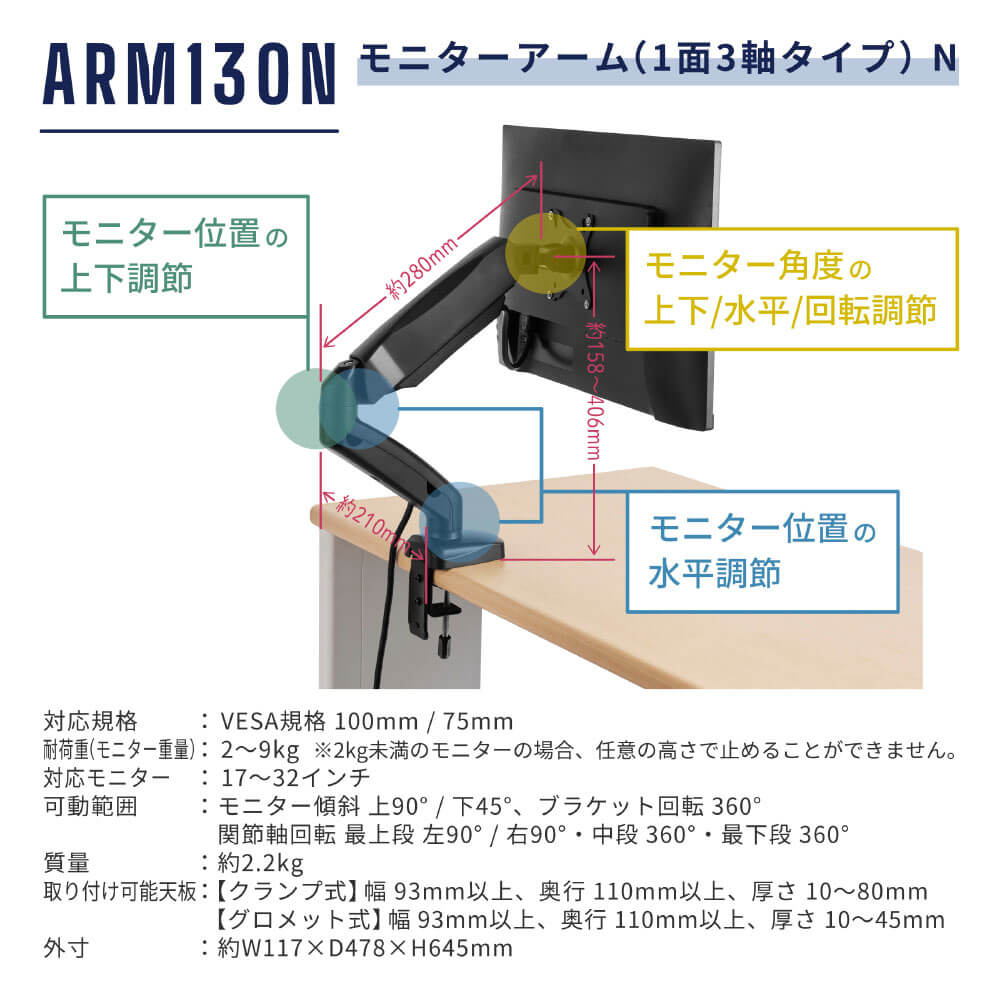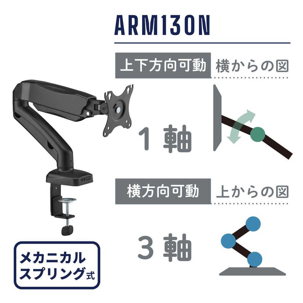 操作性が高くモニター位置の調整がしやすい1面3軸タイプのモニターアームです。上下方向の操作性が高く、モニターの高さと角度の調節が簡単にできます。オフィスでの設置はもちろん自宅でのテレワーク用としても適しています。