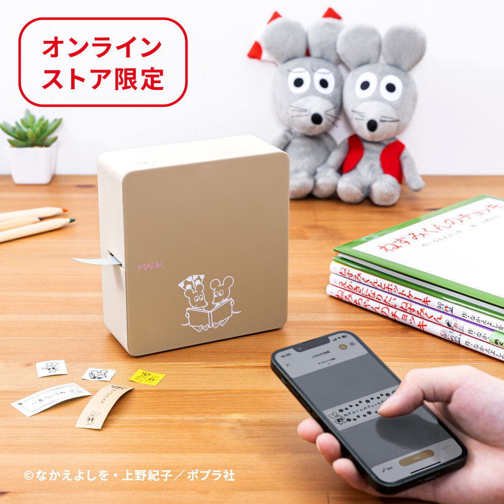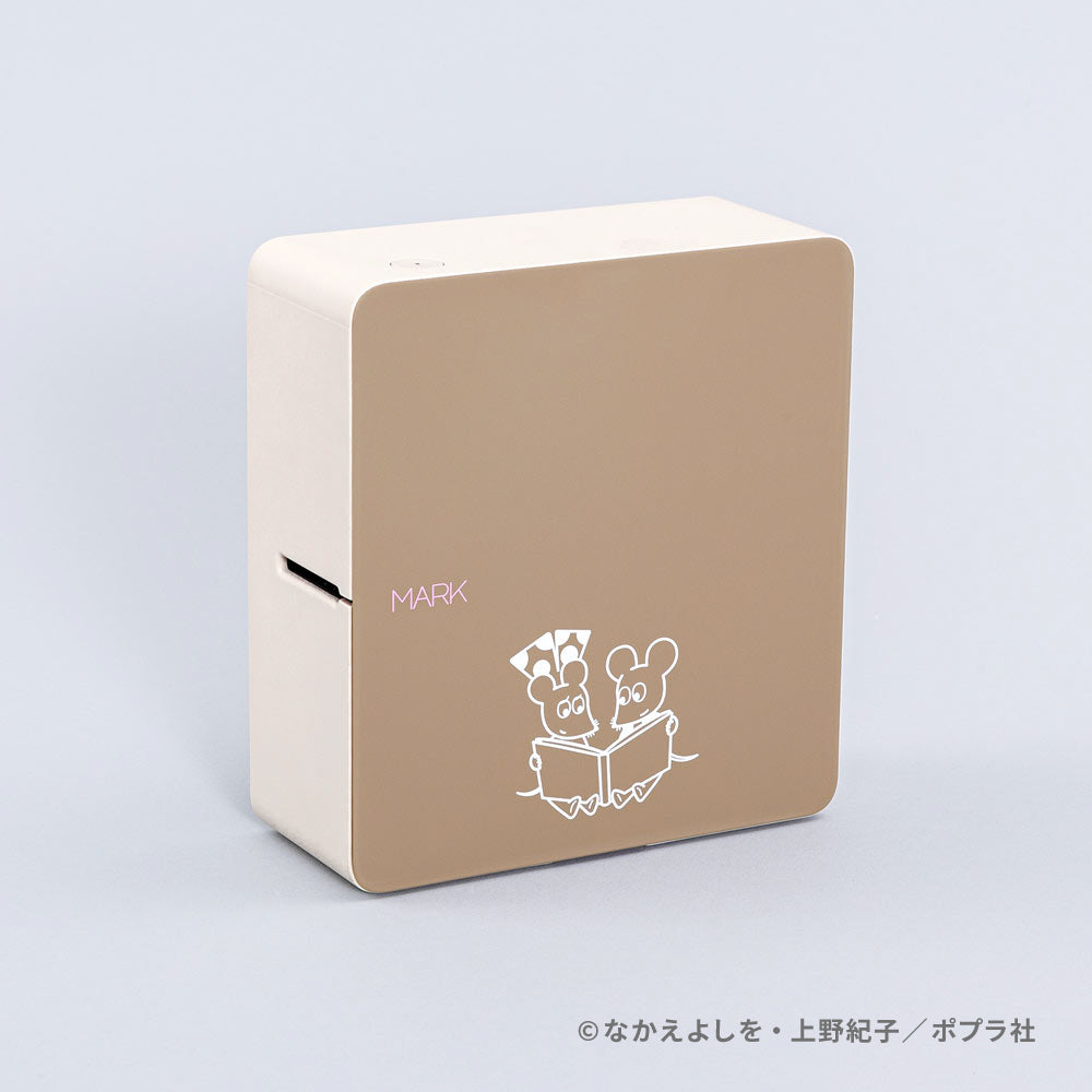 「テプラ」PRO "MARK" SR-MK1 ベージュに「ねずみくんのチョッキ」のねずみくん&ねみちゃんが仲良く絵本を読んでいるイラストをデザインしました。