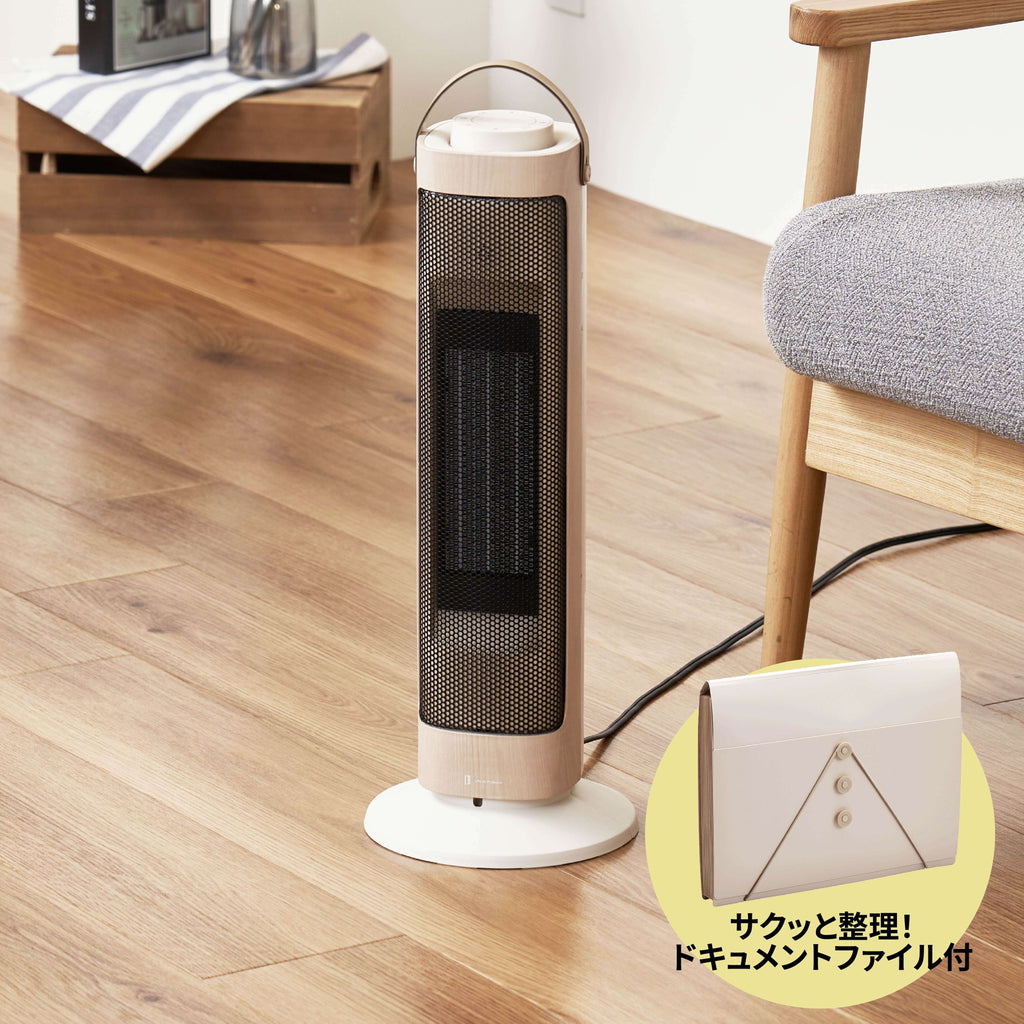 美しい木目柄を採用したスタイリッシュなハイパワーヒーターと厚手の材質でガバッと開いて自立するドキュメントファイル「サクッと整理!ドキュメントファイル フタ付タイプ」のセットです。