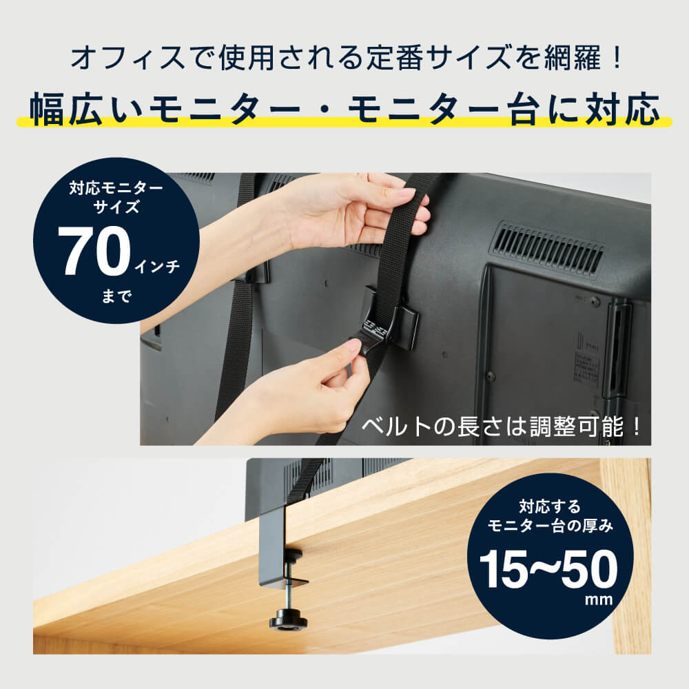 ベルトの長さ調節が可能で、最大70インチ・64kgまでの大型モニターやテレビにも対応します。幅広いサイズの機器に使えるため、オフィスや家庭の様々なシーンで活用できます。モニター台の厚みも15~50mmまで対応しており、汎用性が高いのが特長です。