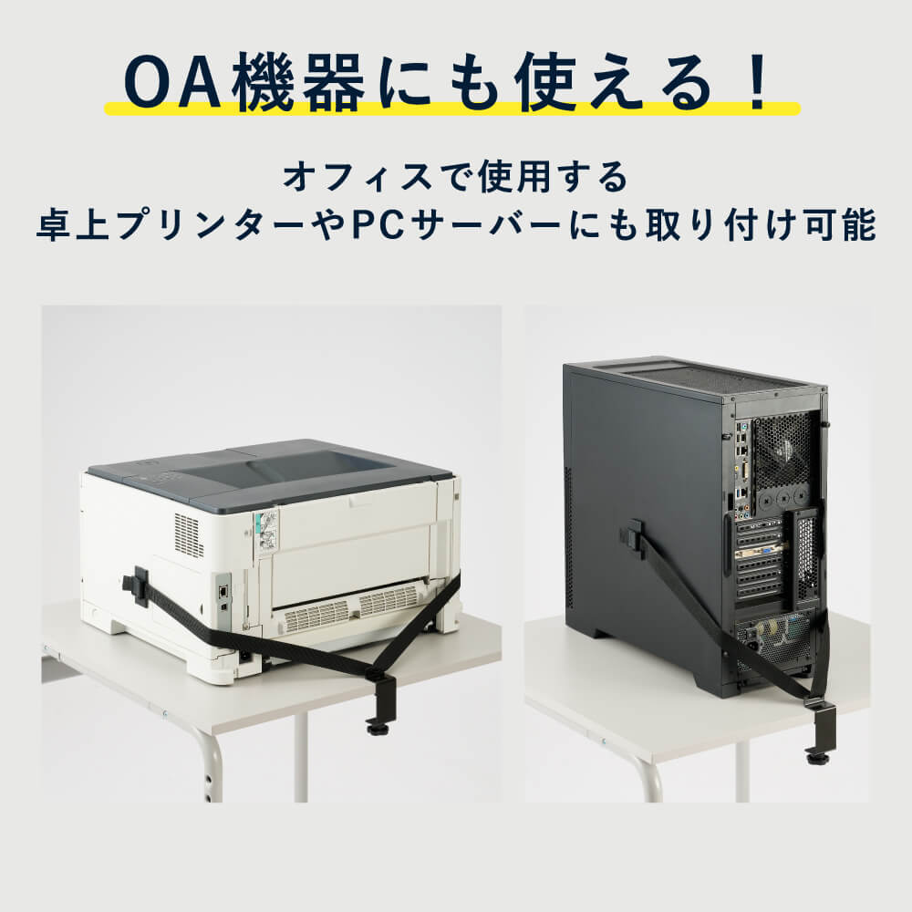 震度7相当の耐震試験をクリアしており、地震などの強い揺れにも耐えられる設計です。また、モニターやテレビの他に、OA機器や卓上プリンターにも取り付けが可能です。ご家庭の地震対策はもちろん、オフィスのBCP対策として、電子機器の落下・破損を防止し、業務再開や安全確保に貢献します。